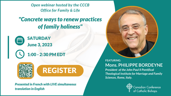 CCCB invites you to attend their free webinar "Concrete Ways to Renew Practices of Family Holinesss" on Saturday, June 3, 2023 from 11 am to 1:30 pm MT is open to all including Bishops, priests, ministry and diocesan leaders, families and anyone interested in the topic and opportunity for reflection. Speaker: Prof. Mons. Philippe Bordeyne, President of the John Paul II Pontifical Theological Institute for the Sciences of Marriage and Family, Rome, Italy. Note: the webinar will be presented in French, but simultaneous translation into English will be provided. Prof. Mons. Bordeyne brings with him a wealth of experience and education in Church teaching on family and marriage.