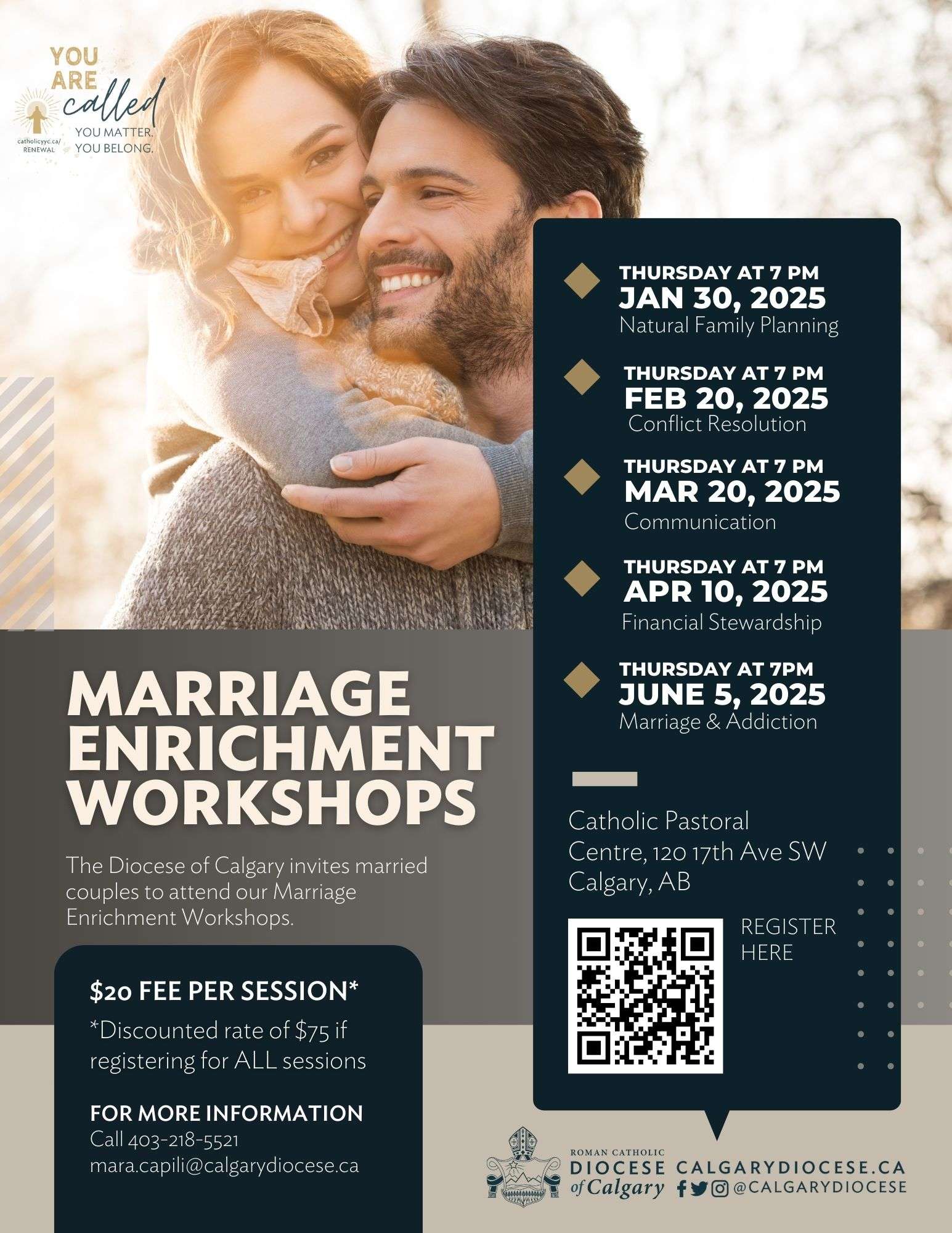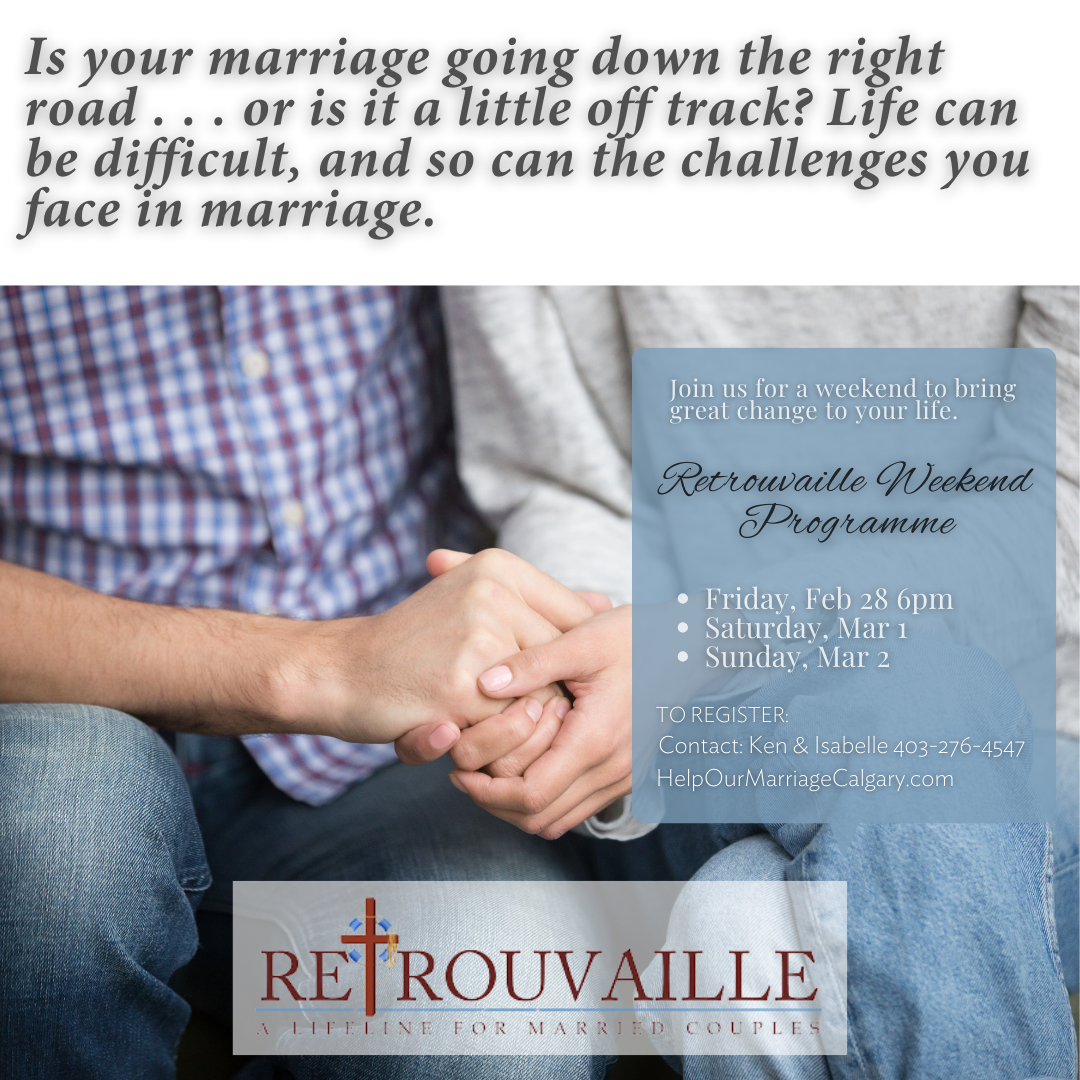 Retrouvaille Calgary is inviting couples to their Weekend Program on Friday, Feb 28 – Sunday, Mar 2. This program is designed for couples who are experiencing challenges in their marriage. Retrouvaille is a peer ministry of volunteer couples that helps couples learn the tools of healthy communication, build intimacy and heal, just as they have done in their marriages. For more information, contact Ken & Isabelle at 403-276-4547 or visit HelpOurMarriageCalgary.com.