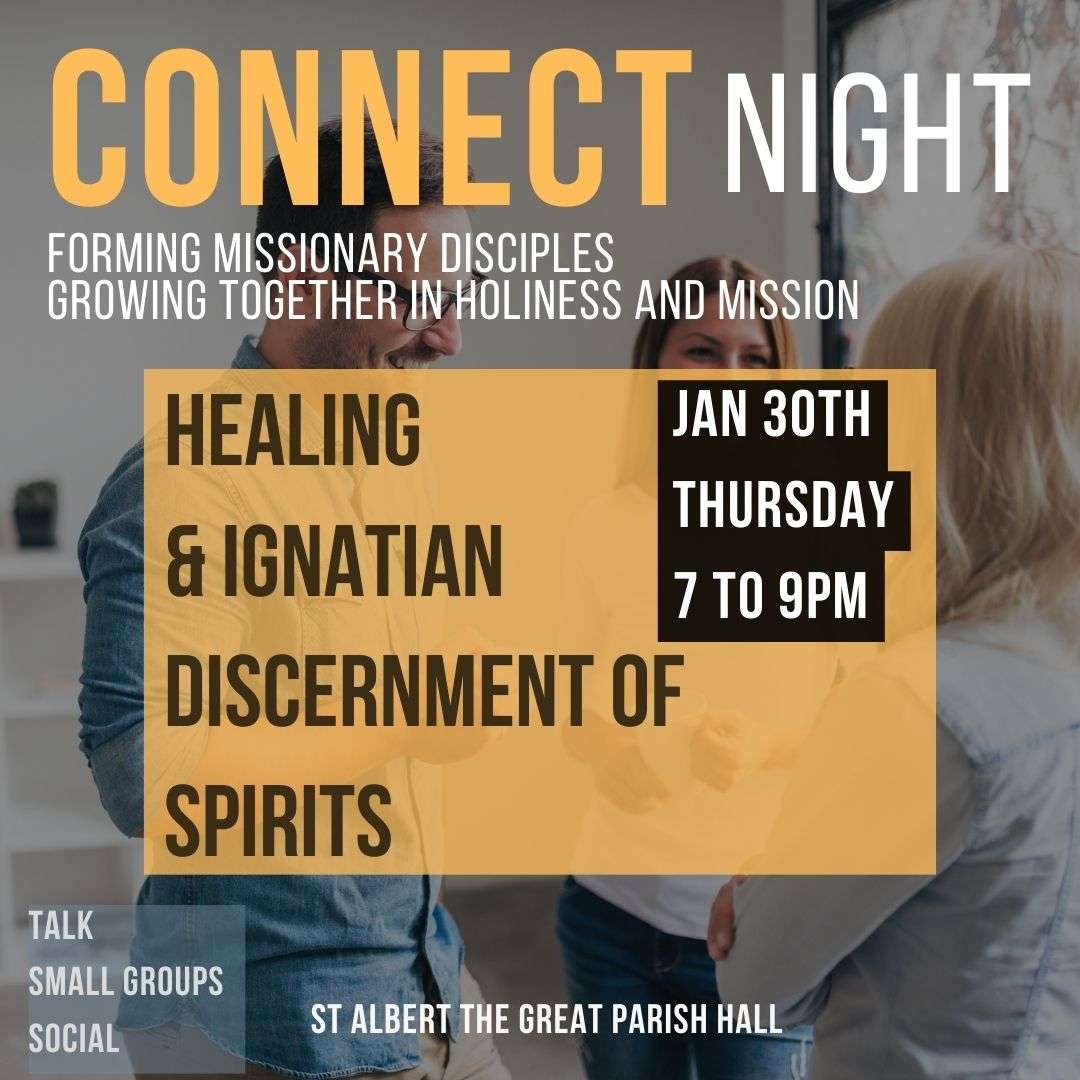 Healing & Discernment: January CONNECT Night What is healing, and why should missionary disciples be interested in this topic? How is it related to discernment? There are parts of our stories that limit our freedom and ability to grow in friendship with Our Lord and with others. In this sense, we all need healing. Come join us as we continue our series on healing and discernment of spirits. Thursday, Jan 30th 7-9pm in the parish hall, following the evening Mass. Talk, small groups, social. Let's grow in holiness and mission together! Questions? Email us comeasyouare.yyc@gmail.com