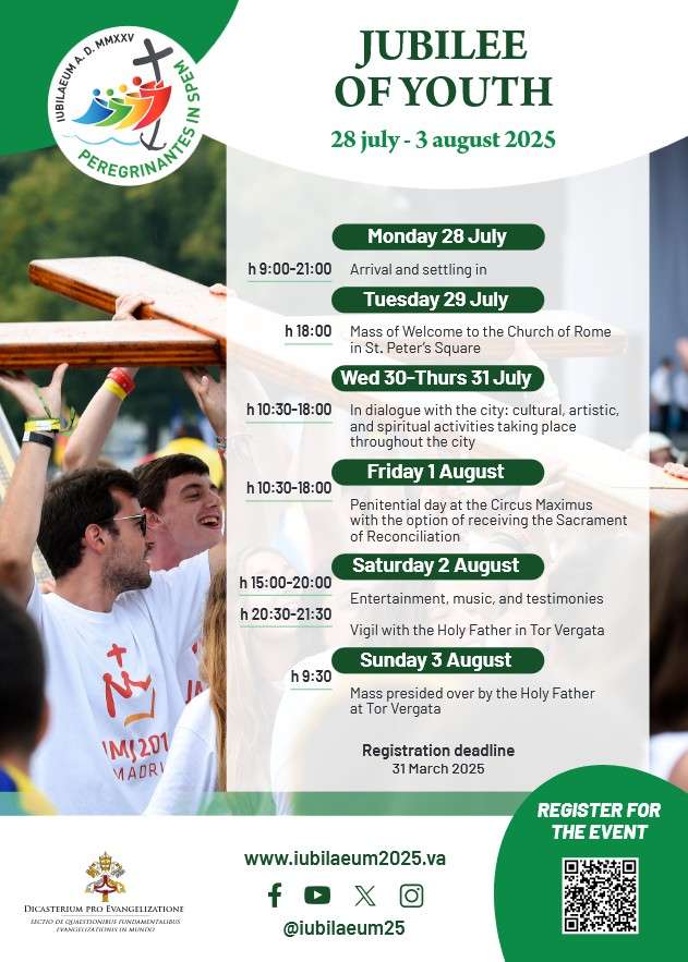 Jubilee of Youth/Young People - sign up by 21 March 2025. Young adults aged 18-35 are invited to the 2025 Jubilee of Youth in Rome from July 28 to August 3. Celebrate this special event with Holy Mass, artistic and spiritual activities, music, testimonies, and a Vigil with the Holy Father at Tor Vergata, Rome.