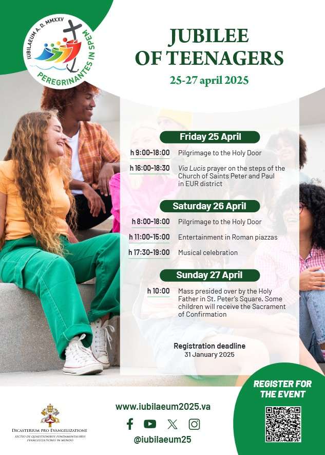 Jubilee of Teenagers sign up by 31 January 2025.Teenagers aged 12-17 are invited to Rome for the Jubilee of Teenagers from April 25-27, 2025. Experience a pilgrimage to the Holy Door, the Via Lucis prayer, musical celebrations, and Mass with the Holy Father, featuring the Sacrament of Confirmation for some participants.